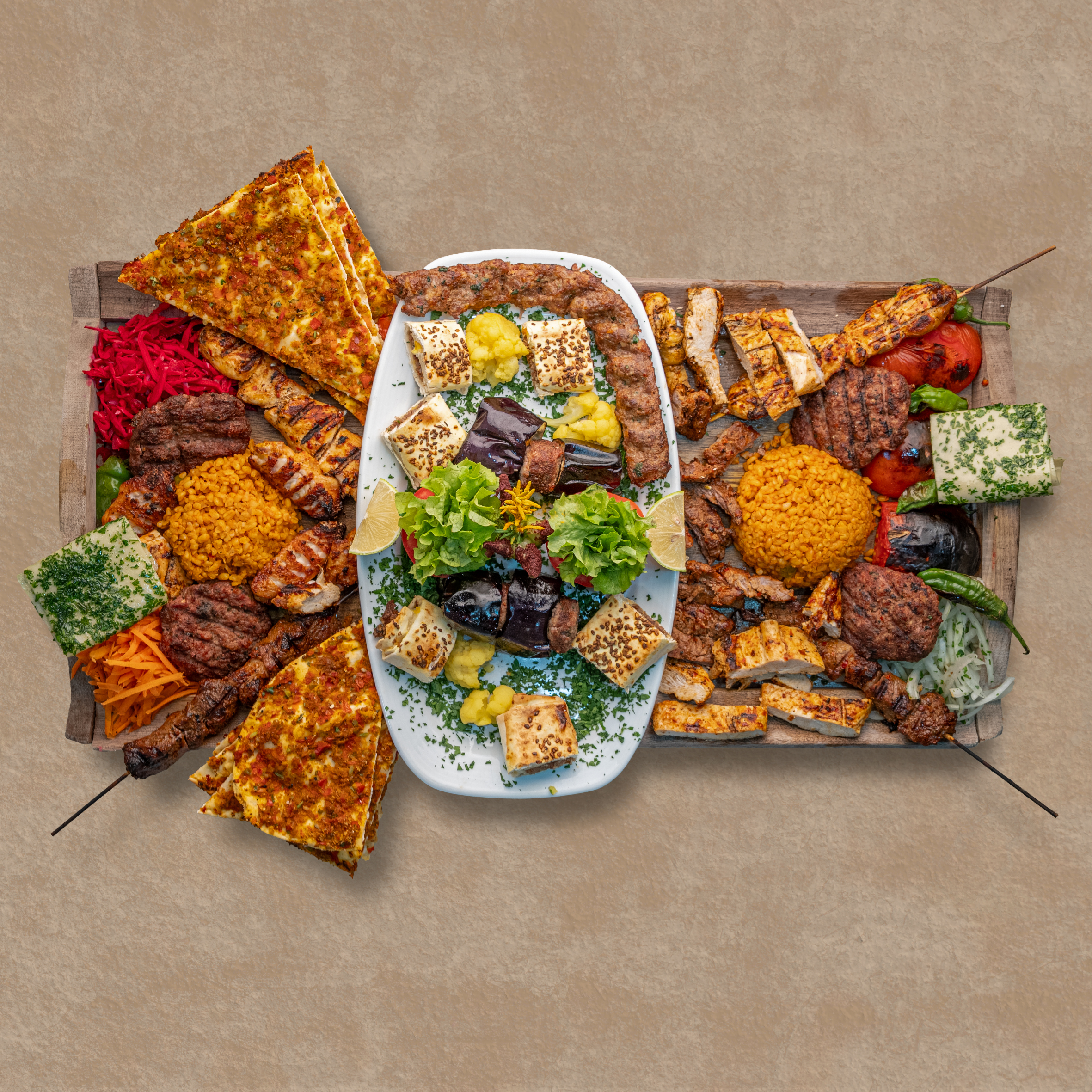 آدانا کباب / ایزگارا کوفته / پاتلیجان کباب / ات چوب شیش / ات بیفتک / تاووک چوب شیش / تاووک بیفتک / کانات / سارما / لاح معجون / بلغور / برنج / دورچین